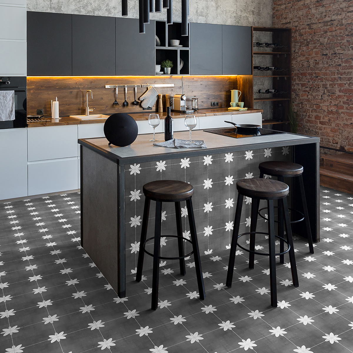 Lowes Fiona Tile, a unique combination of timeless Italian design. History and style collide with this old world black and white encaustic pattern tile. Use our tile visualizer to view your new bathroom tile or tile backsplash in your room today!